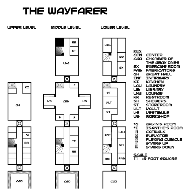 Beyond the living quarters lies the Chamber of the Gray Ones. This room rises to include all three levels of the Wayfarer (the doors on the upper two levels open onto catwalks). Inside, a mysterious device fills most of the room, thrumming with unknown energy. Glyphs and images appear in various places. Gavin (and several other crewmembers) believe the machine is the engine that drives thw Wayfarer.